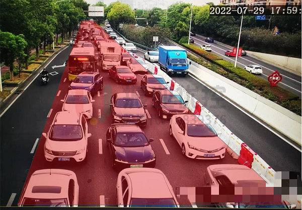 1.車流排隊(duì)較長(zhǎng),同方向直左右流向間排隊(duì)相互阻滯,存在回溢現(xiàn)象