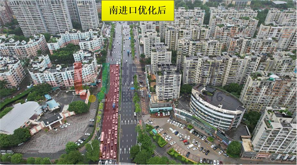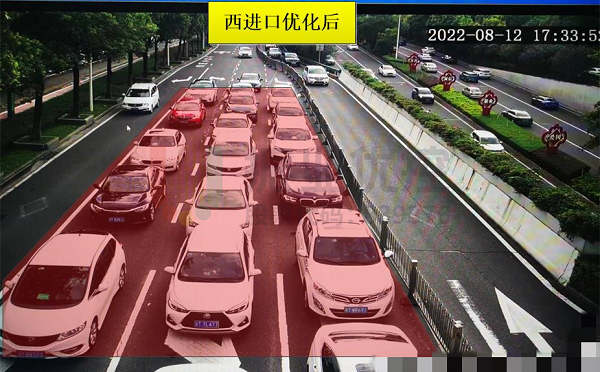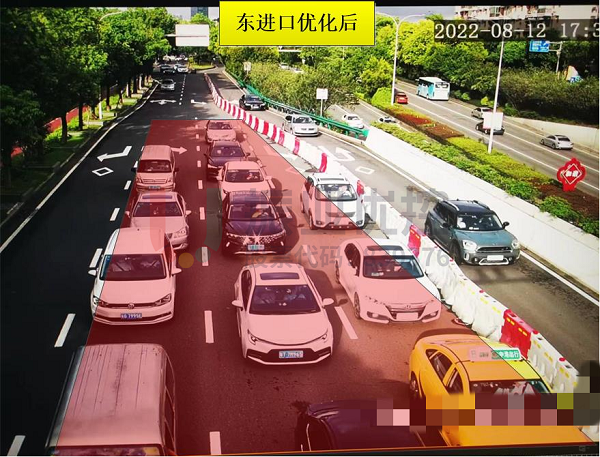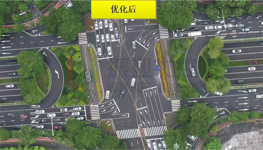 實(shí)施優(yōu)化方案后,該交叉口路況得到明顯改善,各方向的通行效率顯著提升;南向北長(zhǎng)排隊(duì)現(xiàn)象得到有效緩解。