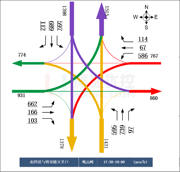 高峰時(shí)段,南進(jìn)口、東進(jìn)口、西進(jìn)口車流量較大,車輛排隊(duì)現(xiàn)象嚴(yán)重,排隊(duì)長(zhǎng)度均在100米以上。