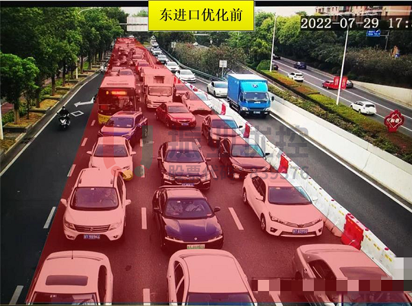 設(shè)置“全方向待行區(qū)”后,有效縮短了各方向車流排隊(duì)長(zhǎng)度,以南進(jìn)口為例,車輛排隊(duì)長(zhǎng)度由優(yōu)化前的300米左右縮短至160米左右(如圖所示);東、西進(jìn)口高峰期排隊(duì)也有明顯改善。具體如下圖所示: