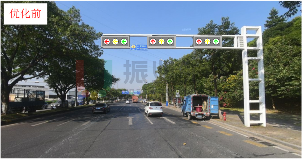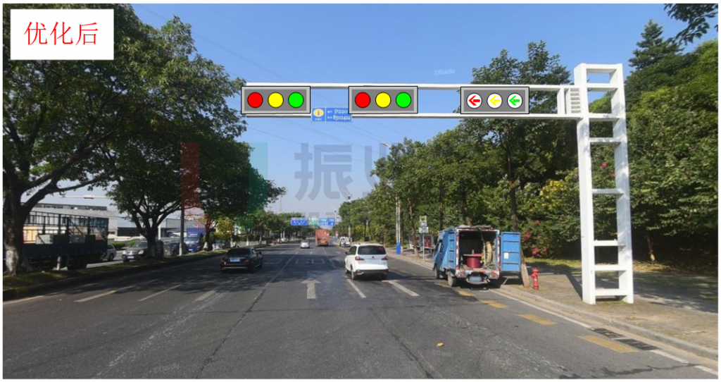 2.根據(jù)車道調(diào)整情況配套調(diào)整信號燈,由“左轉(zhuǎn)+直行+直行”信號燈組合調(diào)整為“全屏+全屏+左轉(zhuǎn)”。