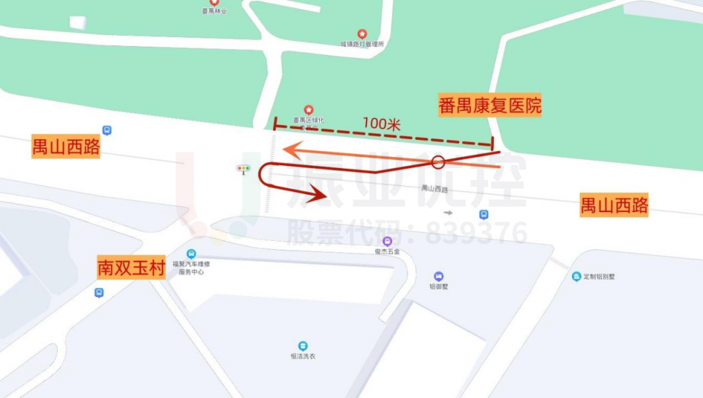 禺山西路東側(cè)設(shè)有番禺康復醫(yī)院出入口,有較多的車輛從該出入口進入禺山西路,并在禺山西路與南雙玉村路口進行掉頭。