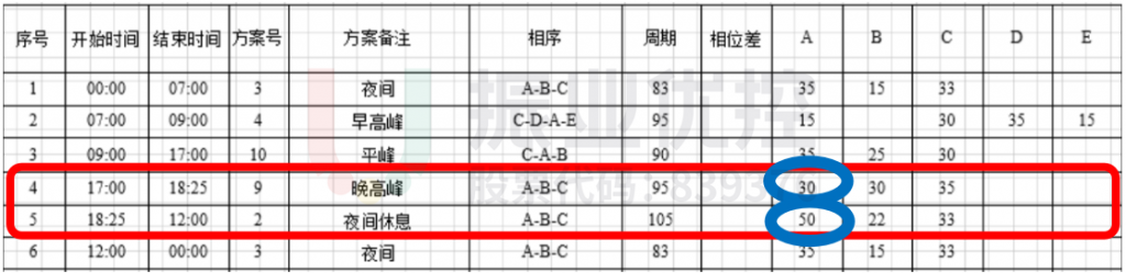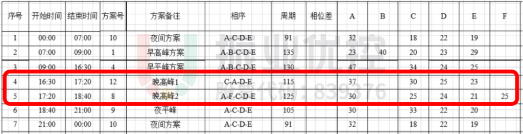 根據(jù)路口不同時(shí)段流量,精細(xì)化設(shè)計(jì)晚高峰方案。晚高峰時(shí)段,根據(jù)附近車流通行需求的變化情況,對時(shí)段進(jìn)行分割。分別在16:30-17:20、17:20-18:40各設(shè)一套方案,以應(yīng)對需求的變化。