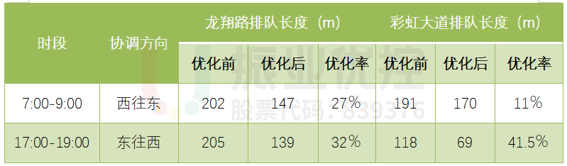 經(jīng)優(yōu)化后,晚高峰世紀(jì)大道-彩虹大道東進(jìn)口與世紀(jì)大道-龍翔路早高峰排隊(duì)長度明顯降低,路口擁堵情況改善明顯。