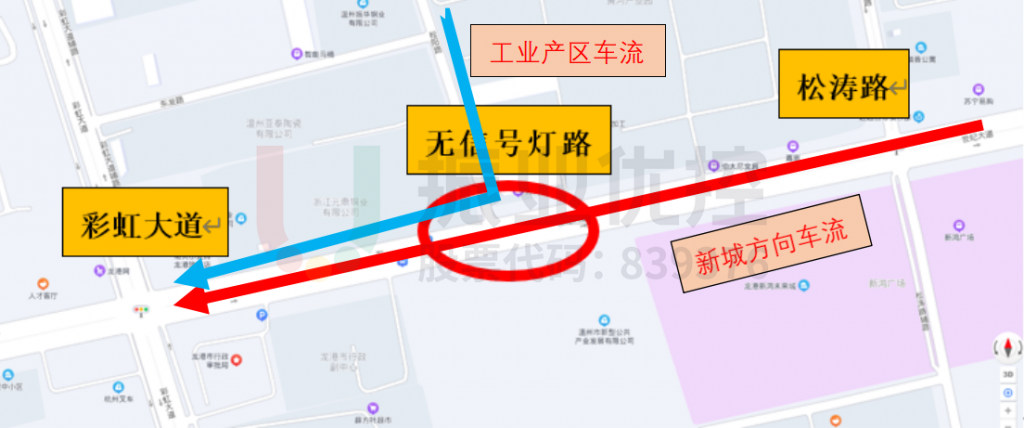 世紀(jì)大道與彩虹大道、龍翔路交匯而成的兩個路口相鄰且距離較近,為400米。其中,世紀(jì)大道-彩虹大道北至平陽縣重要通道車站大道、南連高速路口通道,是龍港市主要交通要點(diǎn);而世紀(jì)大道-龍翔路北進(jìn)口目前正施工中,南進(jìn)口的車道功能與車輛容納能力均受到一定程度影響。