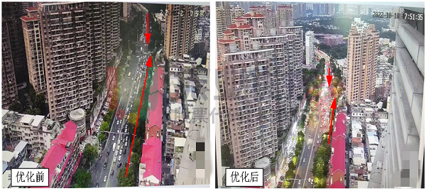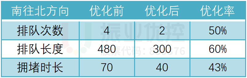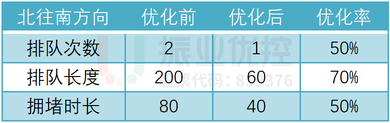 經(jīng)優(yōu)化,路口擁堵時長由原本70分鐘減少為40分鐘,排隊次數(shù)由4次減少為2次,排隊長度也有明顯的下降。
