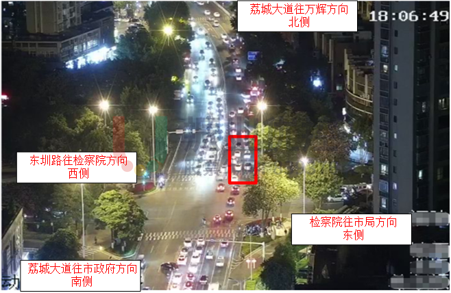 (1)溪南路口與檢察院路口間距只有260米,荔城大道直行車輛一旦與東圳路右轉(zhuǎn)車輛發(fā)生沖突,便會產(chǎn)生擁堵,車流滯留回溢到檢察院路口,嚴(yán)重影響檢察院路口通行。