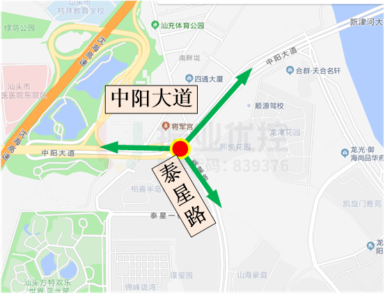 中陽(yáng)泰星路口是汕頭城區(qū)前往東海岸片區(qū)、澄海區(qū)、南澳島等片區(qū)的重要節(jié)點(diǎn)路口。中陽(yáng)大道主線西聯(lián)中泰立交橋引道,主線兩側(cè)輔道與泰星路T字型平交,形成一條U型通道。