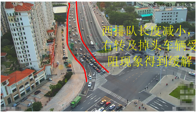本案例深入研究路口交通特點(diǎn),結(jié)合實(shí)際情況對(duì)路口晚高峰方案做出了調(diào)整,針對(duì)拓寬節(jié)點(diǎn)后車(chē)流離散的問(wèn)題,通過(guò)重復(fù)放行減少車(chē)輛在通行中的綠損時(shí)間;另外通過(guò)相位遲啟動(dòng)控制,保障行人過(guò)街安全,并加快尾車(chē)的消散,提升市民出行體驗(yàn)。