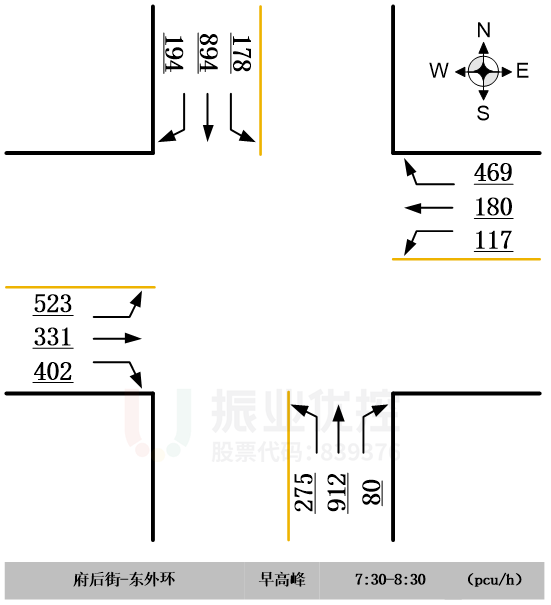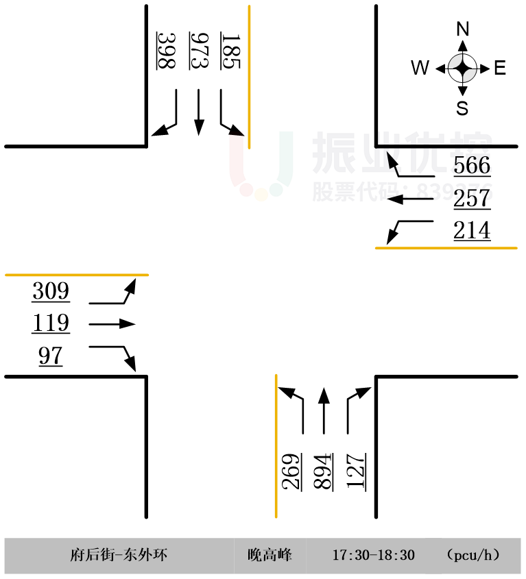路口主要車流為南北直行為主,東進口以右轉車流為主,西進口以左轉車流為主。