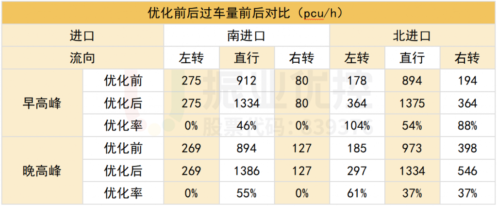 優(yōu)化后,路口整體通行效率明顯增加,排隊長度減少。其中,南北方向二次放行車道利用率增加、車輛等待時間減少,右轉車輛通行效率提高;東西方向通行情況與優(yōu)化前基本一致。