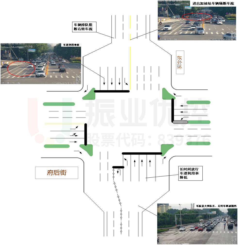 (2)北進口有加油站進出口,常有車輛橫跨東外環(huán)進出加油站,對主路車流通行連續(xù)性影響較大。
