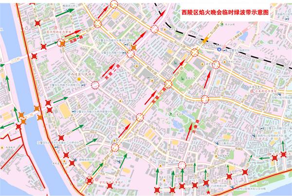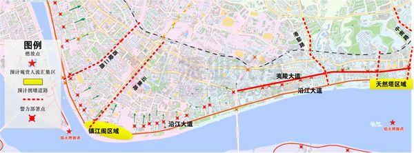優(yōu)化中心結(jié)合歷史觀賞人流數(shù)據(jù),對(duì)六個(gè)焰火燃放點(diǎn)位現(xiàn)場(chǎng)與周邊路網(wǎng)進(jìn)行現(xiàn)場(chǎng)調(diào)研、分析評(píng)估,預(yù)測(cè)出今年人、車流匯集的重點(diǎn)區(qū)域?yàn)槲榧覎忺c(diǎn)軍區(qū)胭脂壩(沿江大道天然塔)附近,其次為西陵區(qū)西壩廟嘴(鎮(zhèn)江閣區(qū)域)。