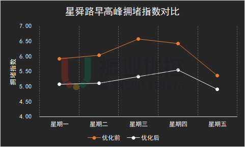 1.優(yōu)化后,星舜路(支路)綠信比由25.17%提升至31.82%。通過監(jiān)測高德?lián)矶轮笖?shù)發(fā)現(xiàn),工作日早高峰星舜路高德平均擁堵指數(shù)5.19,較優(yōu)化前6.06下降約18.7%。