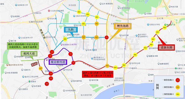 區(qū)域內(nèi)停車位緊張或流量接近飽和時(shí),啟動(dòng)微循環(huán)交通組織方式,禁止車流進(jìn)入千廝門大橋等區(qū)域,在北濱一路節(jié)點(diǎn)路口進(jìn)行臨時(shí)管控,通過渝魯大道快速疏散,緩解內(nèi)部車流壓力。