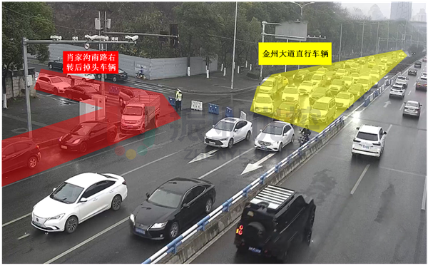 金州大道-平樂路西進(jìn)口最右側(cè)設(shè)置為掉頭與左轉(zhuǎn)右置混合車道,高峰期間,金州大道左轉(zhuǎn)與肖家溝南路左轉(zhuǎn)車流量疊加,加劇最右側(cè)車道擁堵情況的同時,嚴(yán)重影響直行車輛通行。