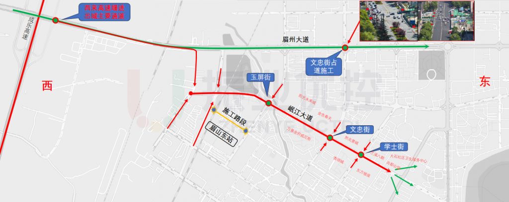 由于成眉市域鐵路S5線眉山東和音樂廣場兩個地鐵站占道施工,高峰時段部分過境、通勤車輛選擇繞行岷江大道進(jìn)入主城區(qū),導(dǎo)致岷江大道西向東車流激增,造成疊加擁堵。