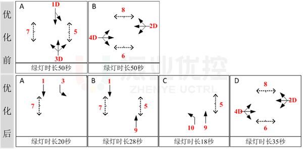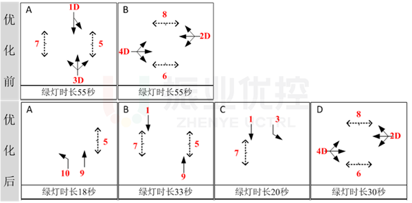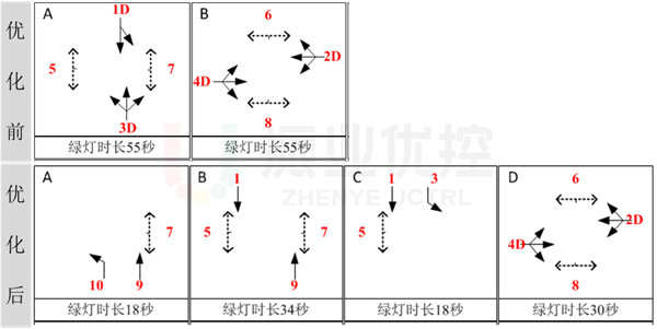 本案例中新改(擴)建的城市道路,通過優(yōu)化相位相序,將原來的簡單兩相位調整為直行-左轉搭接相位相序,減少沖突和延誤;并根據(jù)車流量變化情況,調整配時,減少支路空放情況,提高綠燈利用率;同時將上下游路口進行聯(lián)動綠波協(xié)調,讓信號燈更智能,進一步提升通行效率。