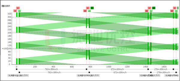 綠波協(xié)調(diào)設(shè)計(jì)中,短間距雙向綠波的協(xié)調(diào)受路段干擾、行車速度變化、高車流影響較大。因而選擇合適的零點(diǎn)路口和設(shè)計(jì)綠波速度尤為關(guān)鍵,同時(shí)還需多次跟車實(shí)測微調(diào),提高綠波設(shè)計(jì)成功的機(jī)率。