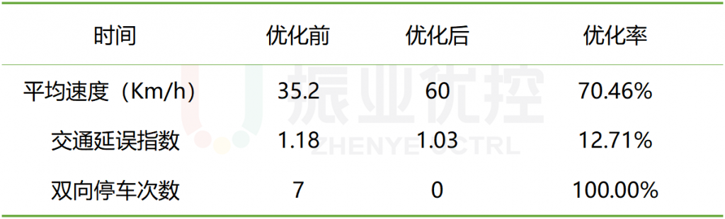 平峰時(shí)段,路段停車次數(shù)由7次減少至0次,路口延誤指數(shù)由1.18下降至1.03,平均行駛速度由35.2km/h提升至60km/h,優(yōu)化率達(dá)70.46%。