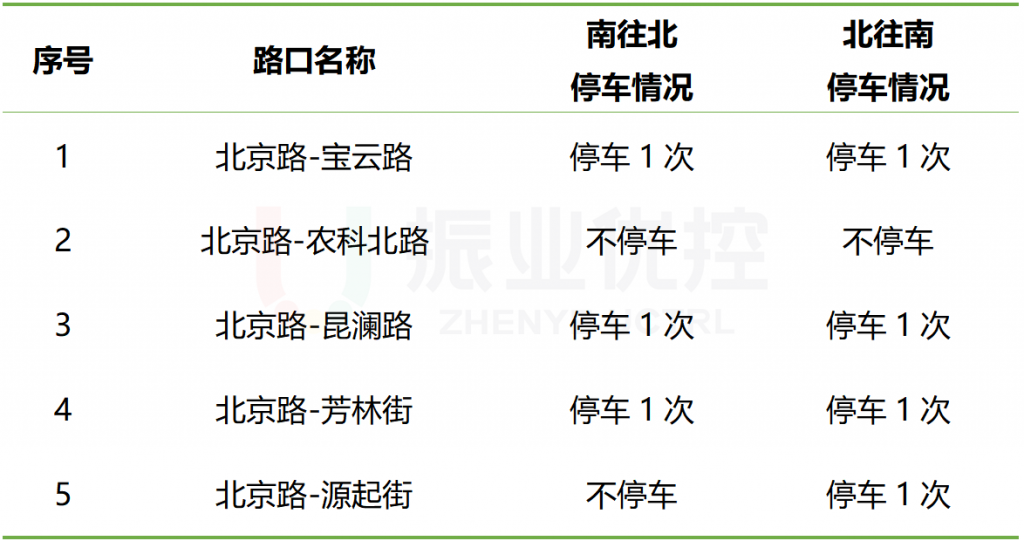 路段上5個路口間距較近,車輛單方向行駛停車3-4次,雙向停車達(dá)7次之多,通行體驗(yàn)感較差。