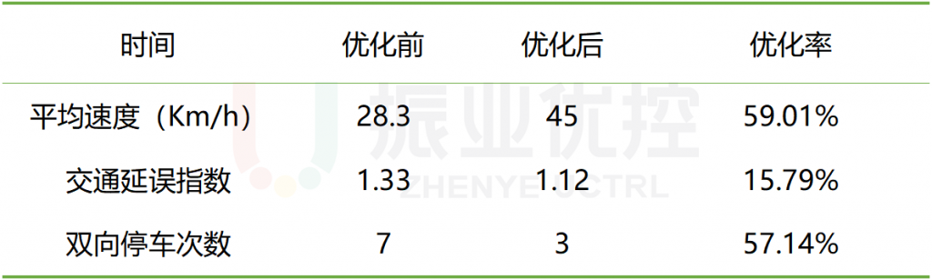 高峰時(shí)段,路段停車次數(shù)由7次減少至3次,路口延誤指數(shù)由1.33下降至1.12,平均行駛速度由28.3km/h提升至45km/h,優(yōu)化率達(dá)59.01%。