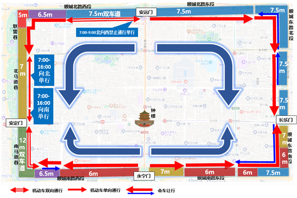 治理成效:對(duì)全段交通組織進(jìn)行整體優(yōu)化后,在保障各類交通參與者合理路權(quán)的基礎(chǔ)上,統(tǒng)籌了周邊居民出行與游客出游,兼顧“行”與“?!钡挠斡[理念,最大程度消除了順城巷通行阻力,為居民打造了“永安”入(永寧門(mén)、安遠(yuǎn)門(mén)),“長(zhǎng)安”出(長(zhǎng)樂(lè)門(mén)、安定門(mén))的機(jī)動(dòng)車流線和綠色慢行示范路段,便于在有限的時(shí)間內(nèi)暢游順城巷。