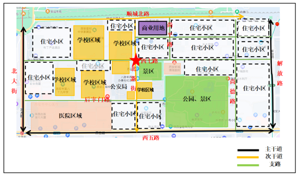 路口概況:北新街與西七路十字位于西安市新城區(qū),“隱藏”于老城片區(qū)內(nèi)的背街小巷當(dāng)中。北新街為南北雙向4車道的次干路,西七路為東西雙向2車道的支路,承擔(dān)著片區(qū)內(nèi)居民交通出行的集散功能,是片區(qū)路網(wǎng)的交通“關(guān)鍵節(jié)點(diǎn)”。
