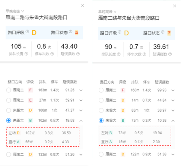 優(yōu)化后交叉口整體排隊(duì)長(zhǎng)度由105米縮短至90米,下降14.28%;平均延誤指數(shù)由43.40下降至39.61,下降8.73%。其中南向西左轉(zhuǎn)方向優(yōu)化效果最為明顯,優(yōu)化后該方向健康評(píng)級(jí)由等級(jí)D提升到B級(jí),排隊(duì)長(zhǎng)度由102米下降至73米,下降28.43%。