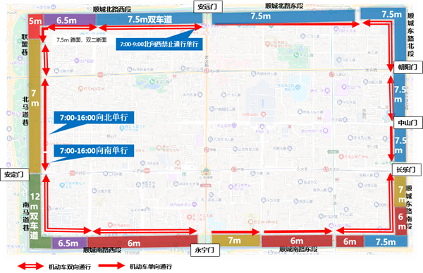 治理措施:將順城巷全段作為慢行友好示范路段進(jìn)行優(yōu)化提升。(1)機(jī)動(dòng)車——“車行可達(dá),街區(qū)內(nèi)循環(huán)”保證交通支路服務(wù)功能。以四個(gè)主城門(mén)為流線集散樞紐,劃分四個(gè)象限片區(qū),整體流線以“東西分散,南北聚集”為統(tǒng)一原則,強(qiáng)化單行主方向,在片區(qū)內(nèi)各城門(mén)間順城巷設(shè)置單行微循環(huán)。