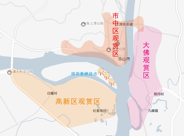 本次活動觀賞區(qū)分為大佛景區(qū)、市中區(qū)與高新區(qū),活動前后,三個觀賞區(qū)域的沿江觀賞道路進(jìn)行臨時(shí)交通管制。