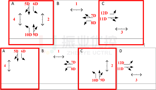 南進(jìn)口機(jī)動(dòng)車(chē)道設(shè)置由“1左轉(zhuǎn)+1直行+1直右混合”調(diào)整為“1左轉(zhuǎn)+1直左混合+1直右混合”;南北進(jìn)口放行方式由原來(lái)的“南北混放”調(diào)整成南、北進(jìn)口“單邊放行”。
