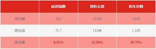 春華路-柏楊東路、 春華路-竹公溪街兩個(gè)路口的延誤指數(shù)、排隊(duì)長(zhǎng)度和停車次數(shù)均有不同程度的下降。