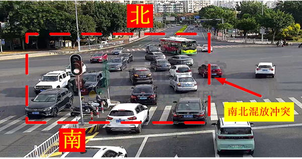問題簡述:工作日早晚高峰路口南向西左轉(zhuǎn)車流通行需求極大,排隊(duì)溢出至上游路口問題頻發(fā)。