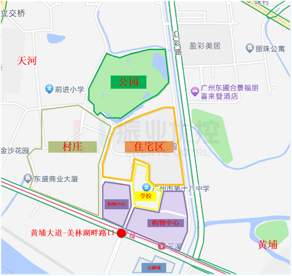 黃埔大道-美林湖畔路口位于廣州市天河區(qū)東南部,西接天河區(qū)車陂街道,東與黃埔區(qū)魚珠街道相連。黃埔大道是連接天河區(qū)與黃埔區(qū)之間的重要交通道路,周邊遍布大型住宅區(qū)、學(xué)校、購物中心。