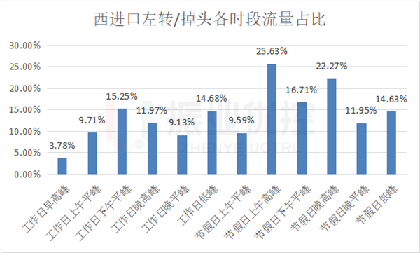 節(jié)假日經(jīng)西進(jìn)口左轉(zhuǎn)前往購物中心(宜家、山姆等)的車輛較多,排隊(duì)較長,出現(xiàn)左轉(zhuǎn)車占據(jù)直行車道等待,妨礙掉頭與直行車正常通行的情況,造成直行車道資源得不到有效利用。