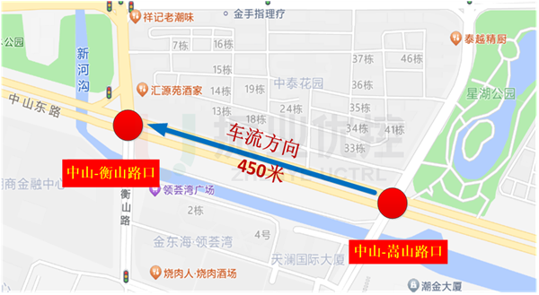 下游中山-衡山路口距離中山-嵩山路口較近,路段蓄車空間有限,高峰時(shí)段中山-衡山路口東往西方向車流頻繁回溢至中山-嵩山路口西出口,影響中山-嵩山路口通行效率。